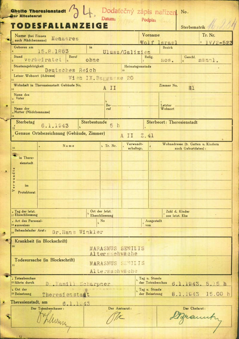 Menaszres Wolf: Death certificate, Ghetto Terezín