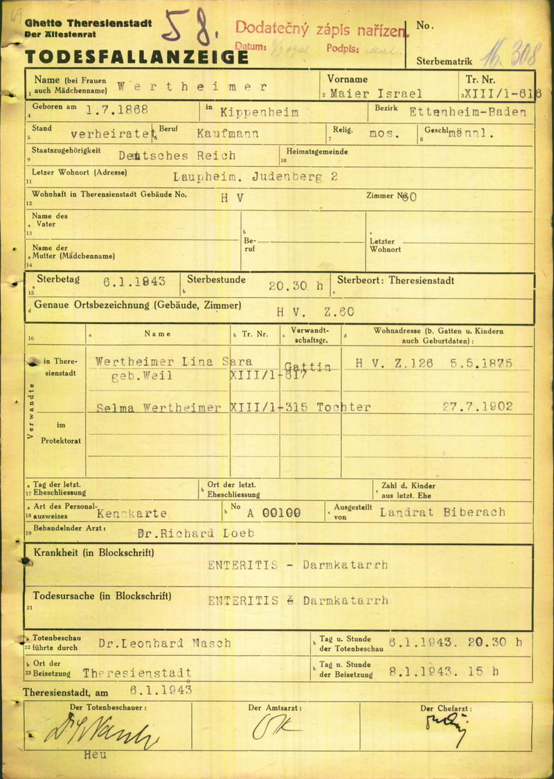 Wertheimer Maier: Death certificate, Ghetto Terezín