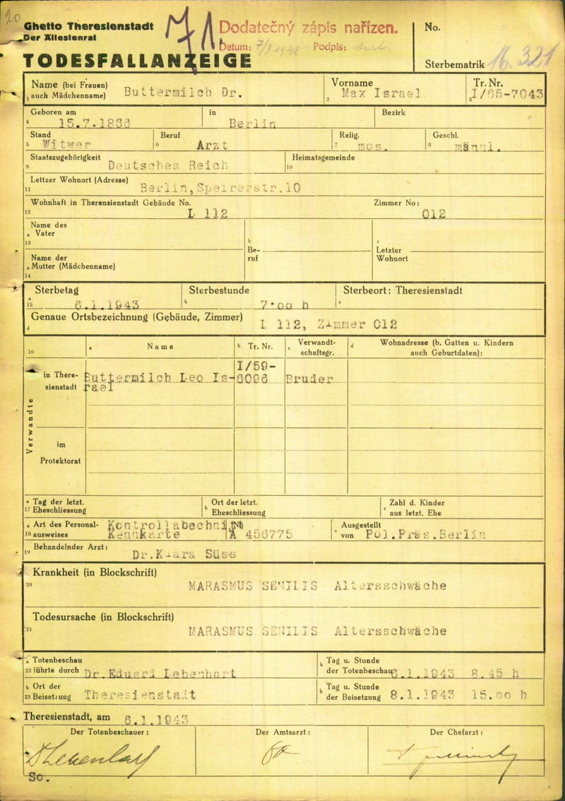 Buttermilch Max: Death certificate, Ghetto Terezín