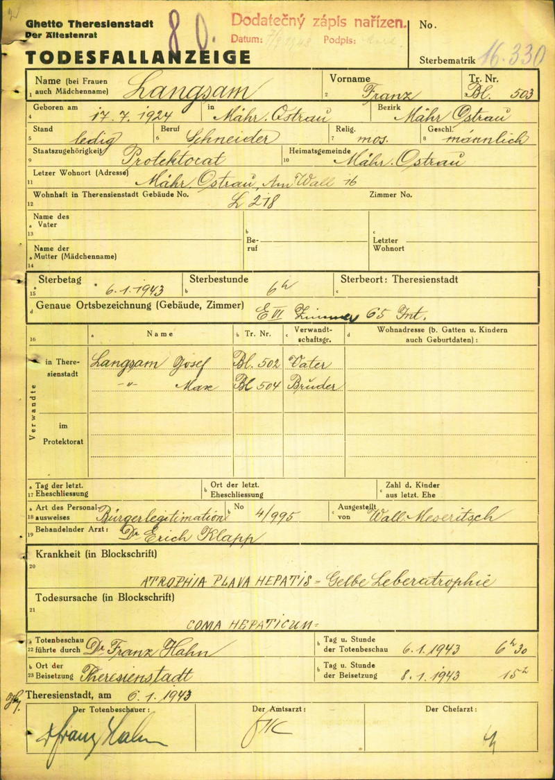 Langsam Franz: Death certificate, Ghetto Terezín