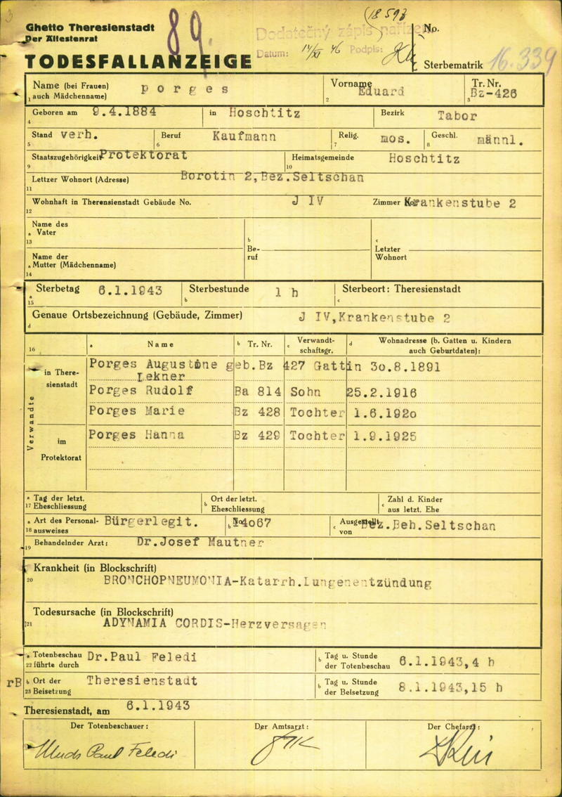 This database contains the names and fates of those who were deported from the territory of today’s Czech Republic, be it their homeland or may they have been deported to the Theresienstadt ghetto before from different european countries. Further, it contains basic information on those men, women and children, most of whom were Roma or Sinti, who died as prisoners of the so-called „Gypsy camp I“ Lety u Písku.