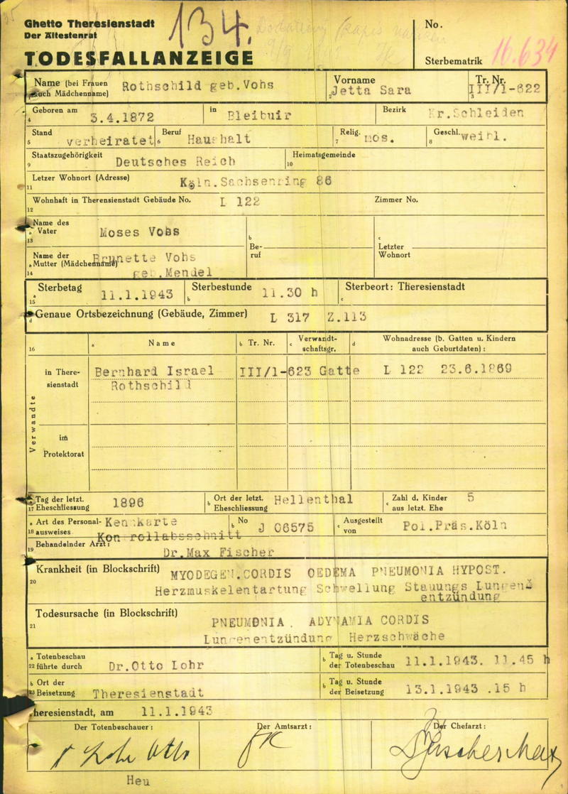 Rothschild Henriette: Death certificate, Ghetto Terezín