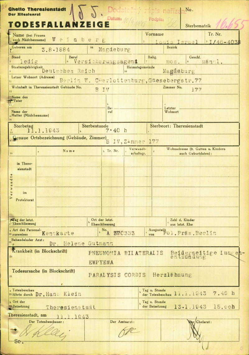 Weinberg Louis: Death certificate, Ghetto Terezín
