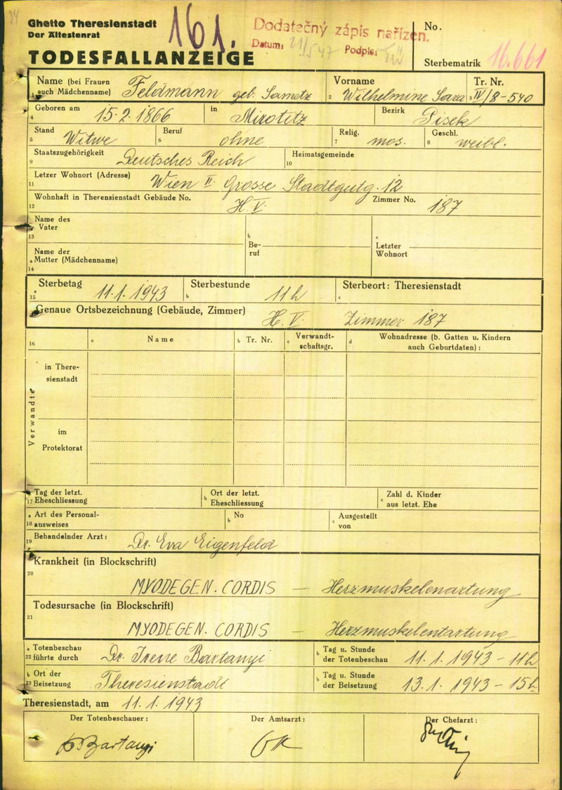 Feldmann Wilhelmine: Death certificate, Ghetto Terezín