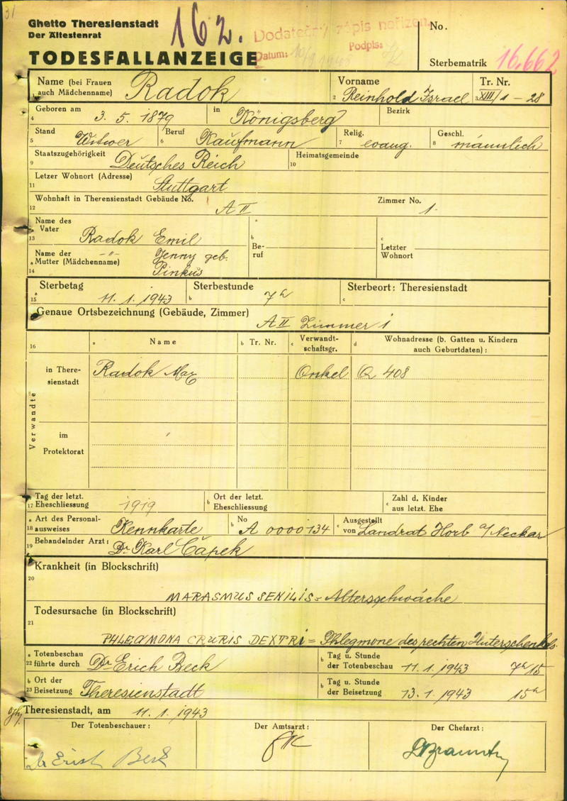 Radok Reinhold: Death certificate, Ghetto Terezín