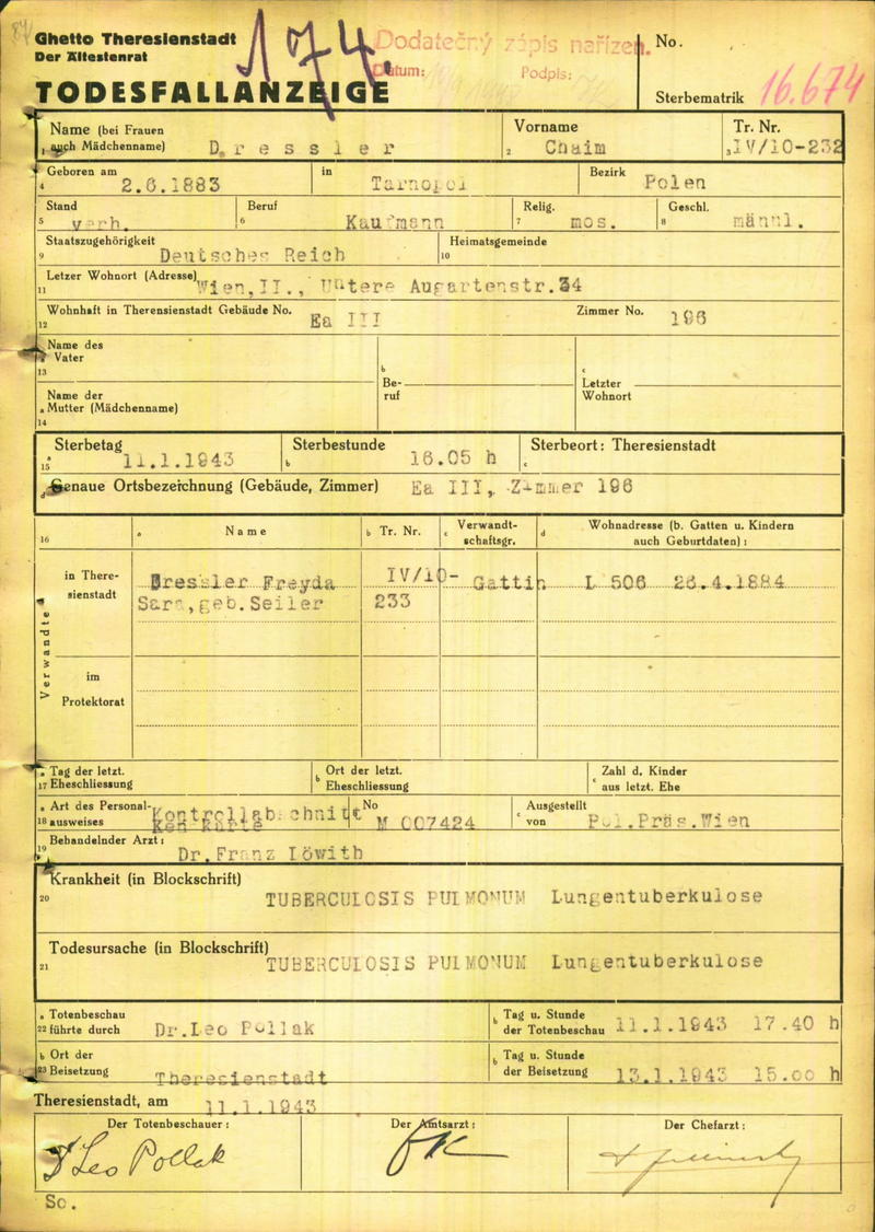 Dressler Chaim: Death certificate, Ghetto Terezín