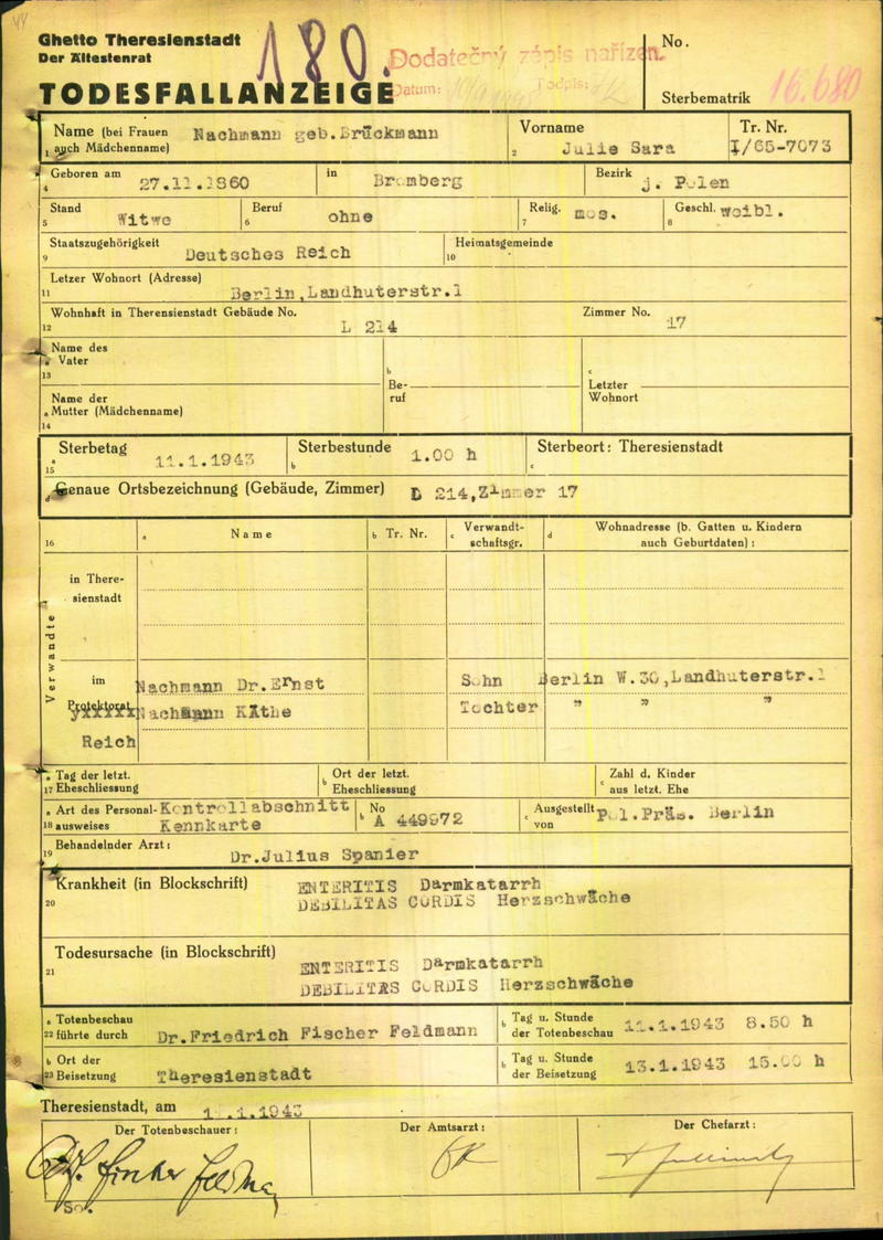 Nachmann Julie: Death certificate, Ghetto Terezín