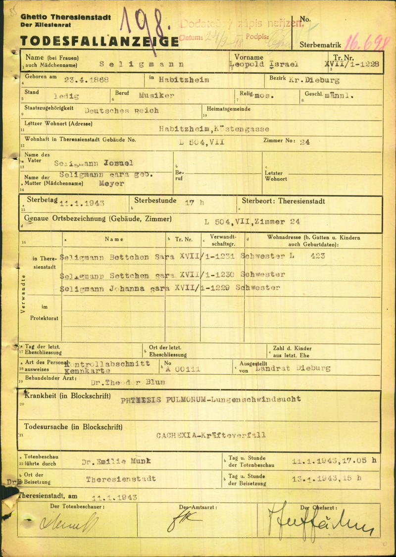 Seligmann Leopold: Death certificate, Ghetto Terezín