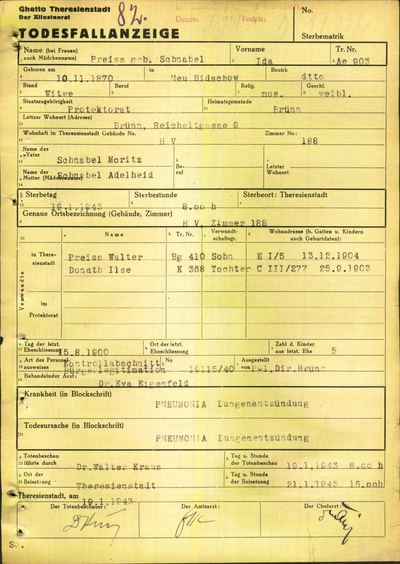 Preissová Ida: Death certificate, Ghetto Terezín