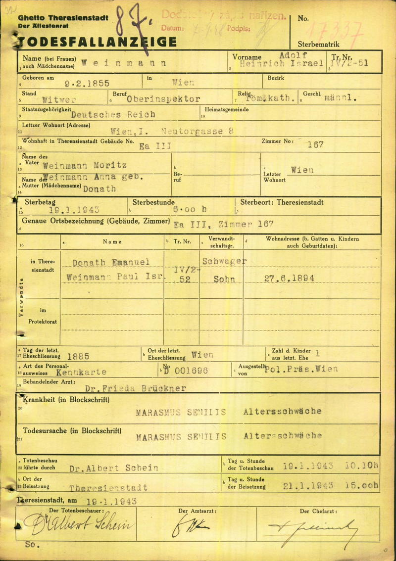 Weinmann Adolf Heinrich: Death certificate, Ghetto Terezín