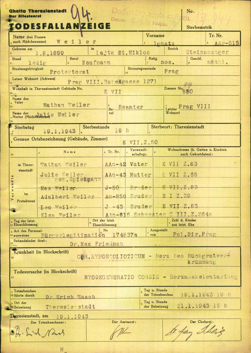 Weiler Hynek: Death certificate, Ghetto Terezín