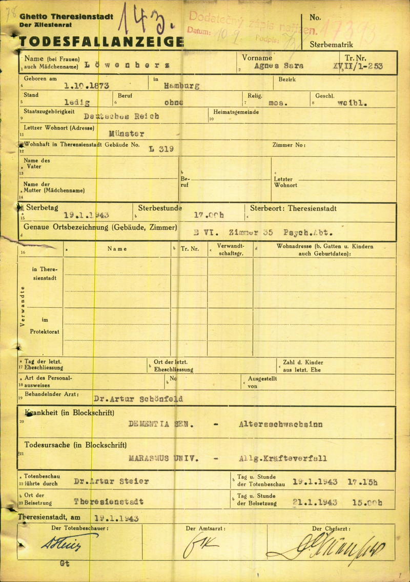 Löwenherz Agnes: Death certificate, Ghetto Terezín