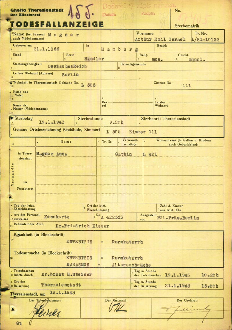 Magner Emil Artur: Death certificate, Ghetto Terezín