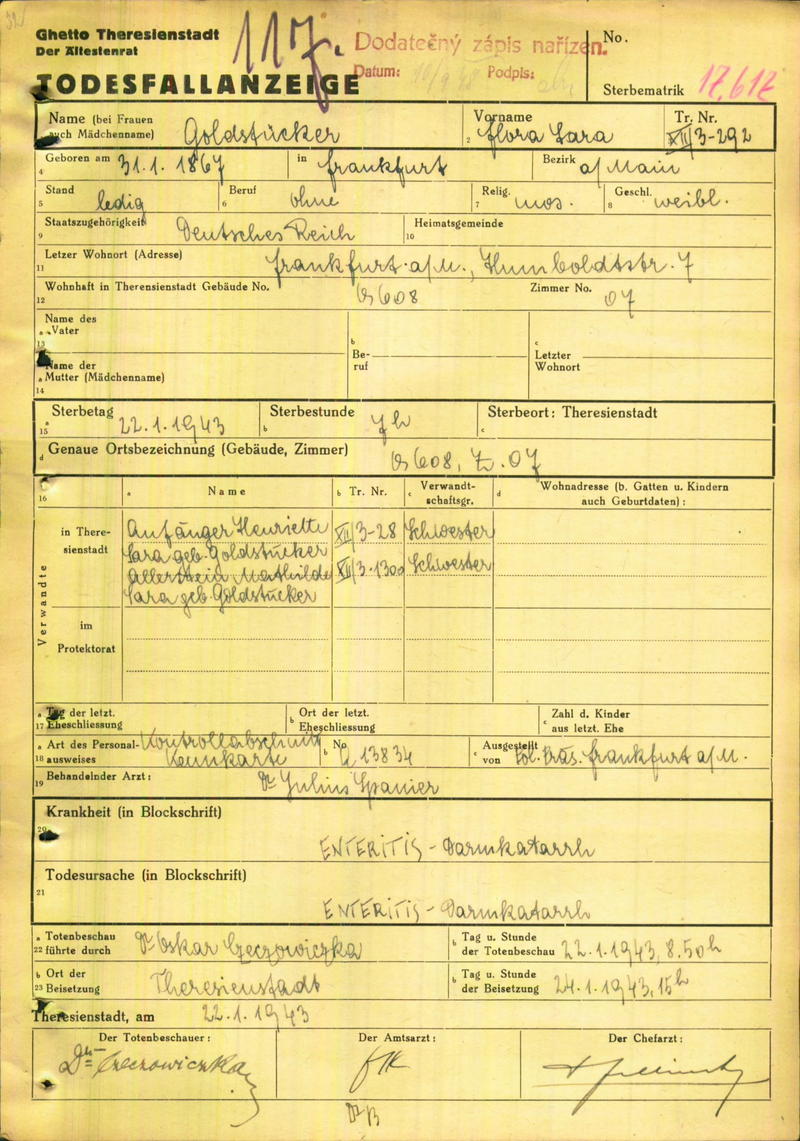 Goldstücker Flora: Death certificate, Ghetto Terezín