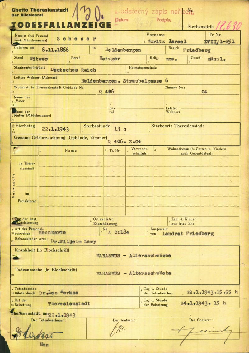 Scheuer Moriz: Death certificate, Ghetto Terezín