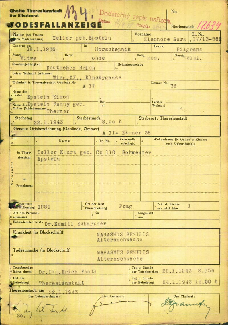 Teller Eleonore: Death certificate, Ghetto Terezín