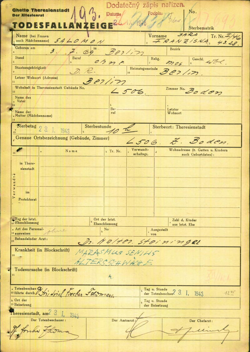 Salomon Franziska: Death certificate, Ghetto Terezín