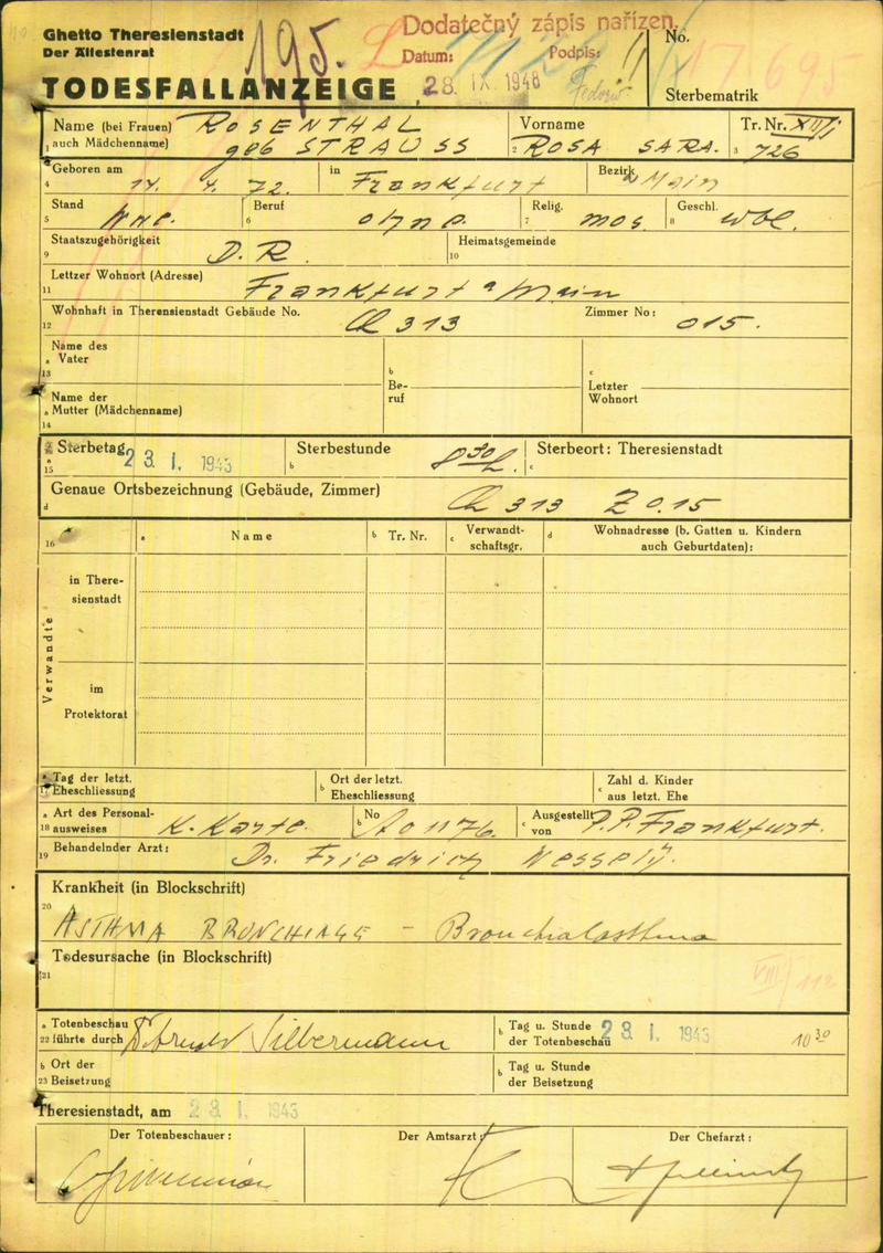 Rosenthal Rosa: Death certificate, Ghetto Terezín