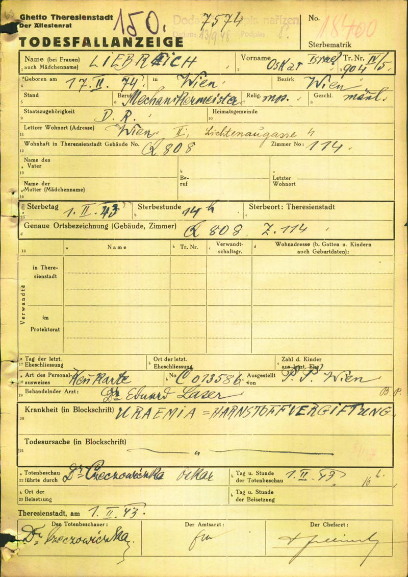 Liebreich Oskar: Death certificate, Ghetto Terezín