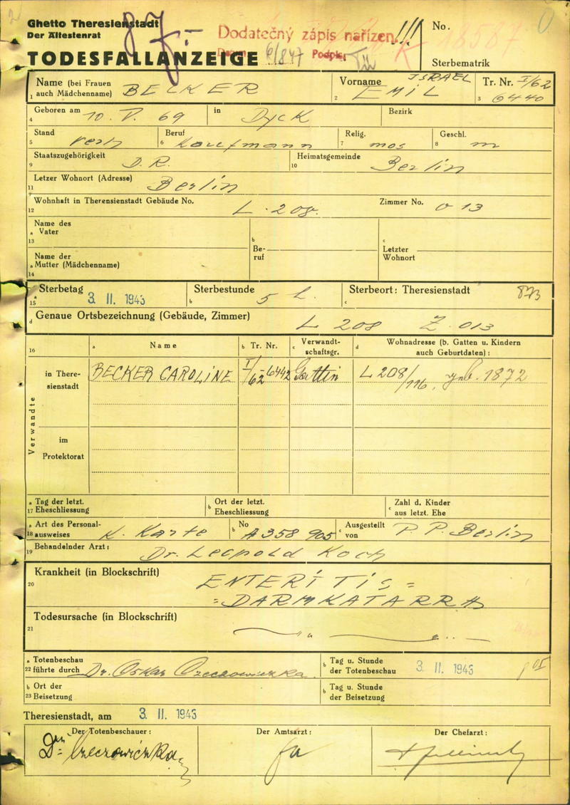 Becker Emil: Death certificate, Ghetto Terezín