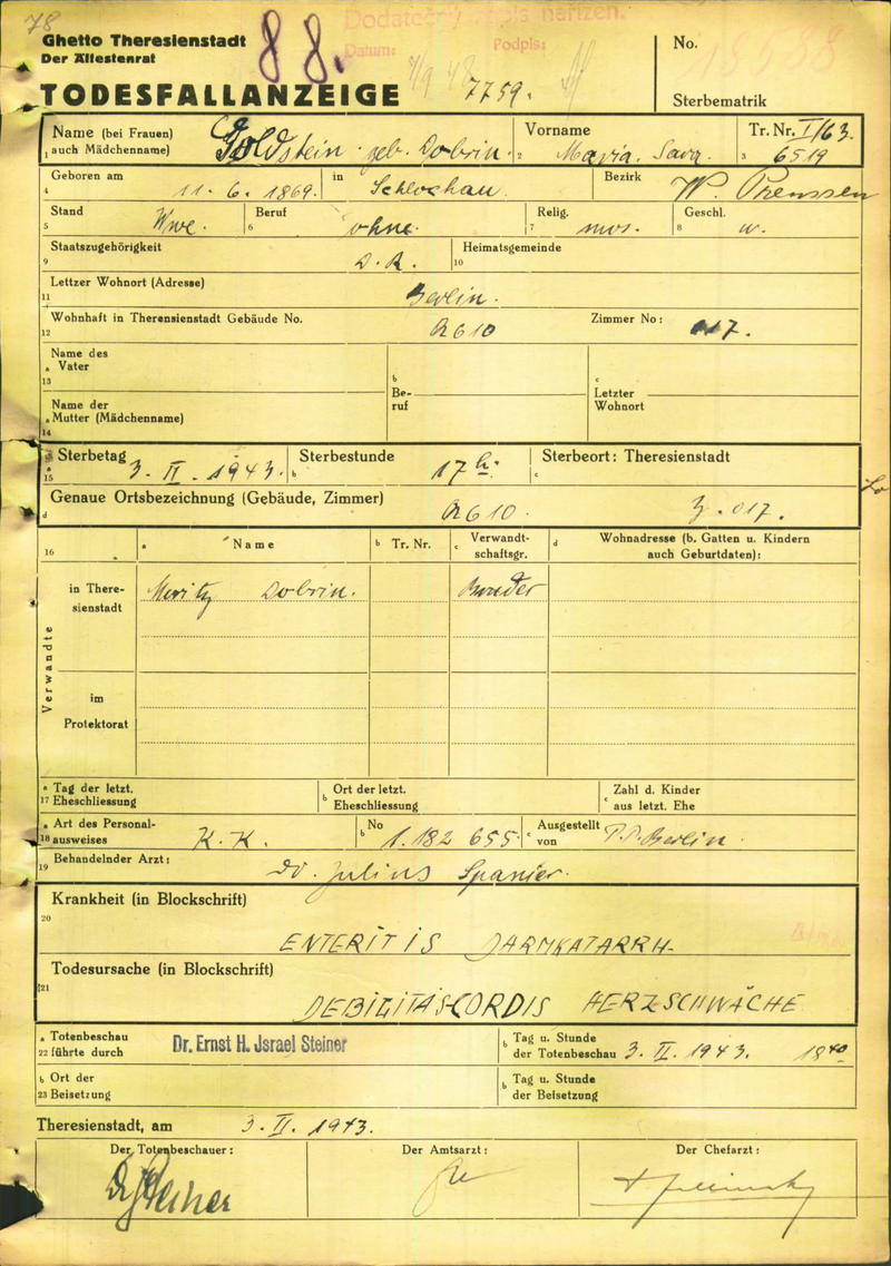 Goldstein Marie: Death certificate, Ghetto Terezín