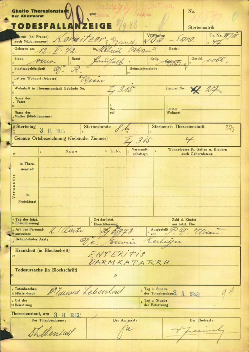 Kornitzer Ida: Death certificate, Ghetto Terezín