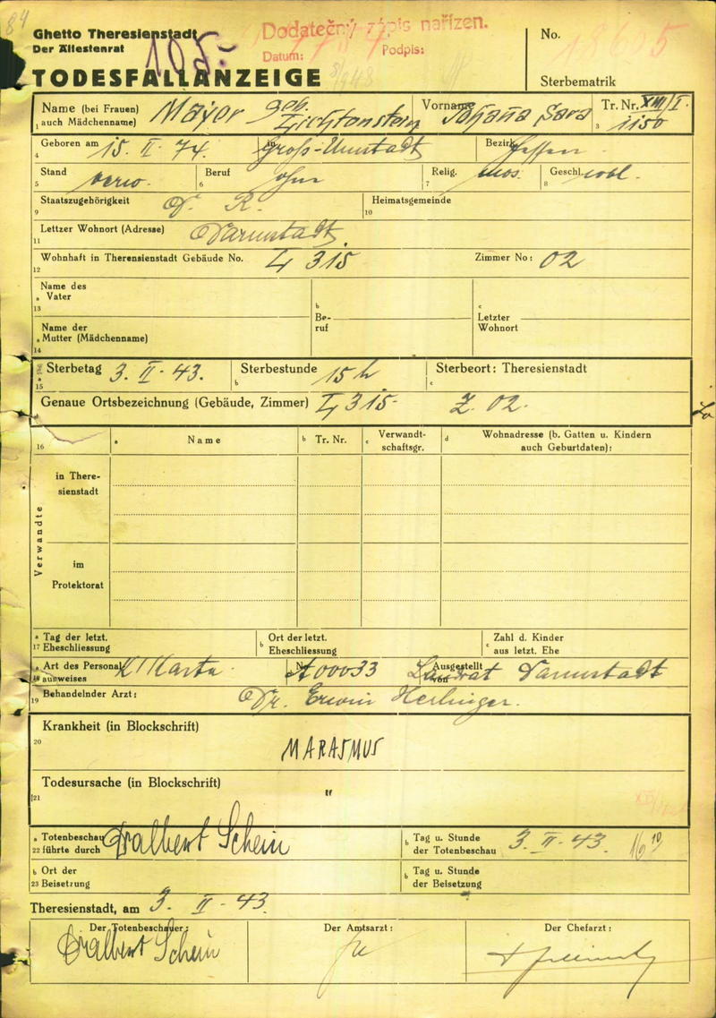 Mayer Johanna: Death certificate, Ghetto Terezín