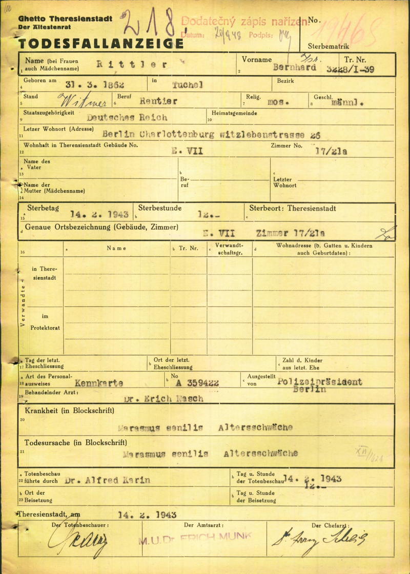 Rittler Bernhard: Death certificate, Ghetto Terezín