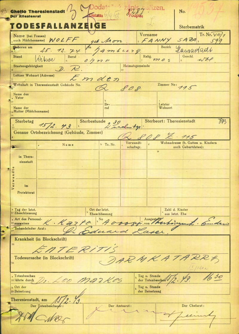 Wolff Fanny: Death certificate, Ghetto Terezín