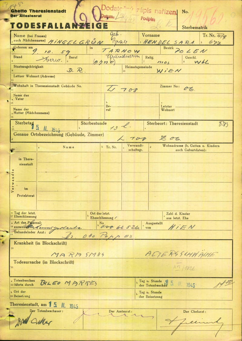 Mingelgrün Hendel: Death certificate, Ghetto Terezín