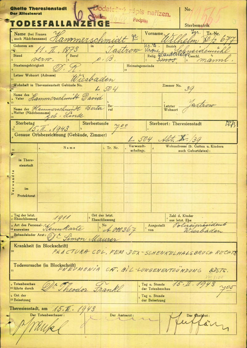 Hammerschmidt Wilhelm: Death certificate, Ghetto Terezín