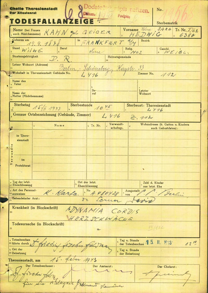 Kahn Hedwig: Death certificate, Ghetto Terezín