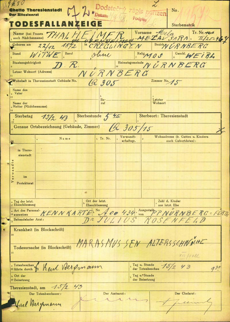 Thalheimer Meta: Death certificate, Ghetto Terezín