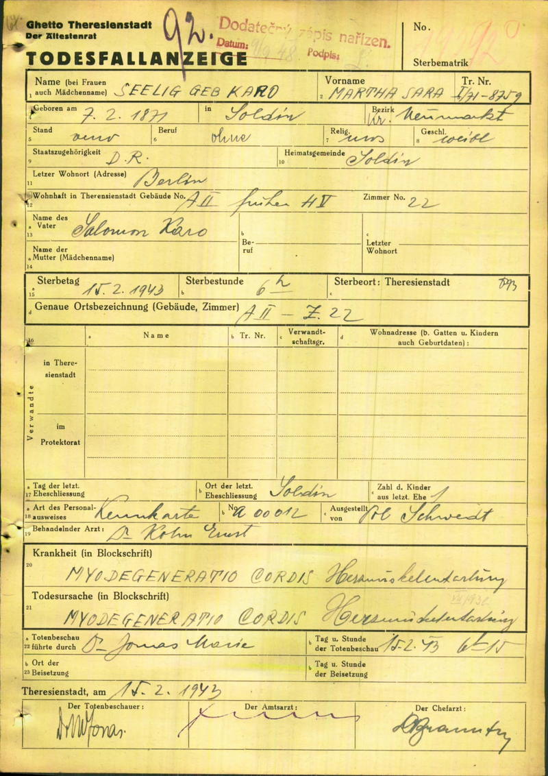 Seelig Martha: Death certificate, Ghetto Terezín