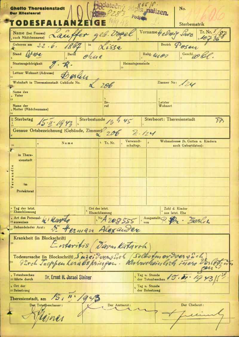 Lauffer Hedwig: Death certificate, Ghetto Terezín