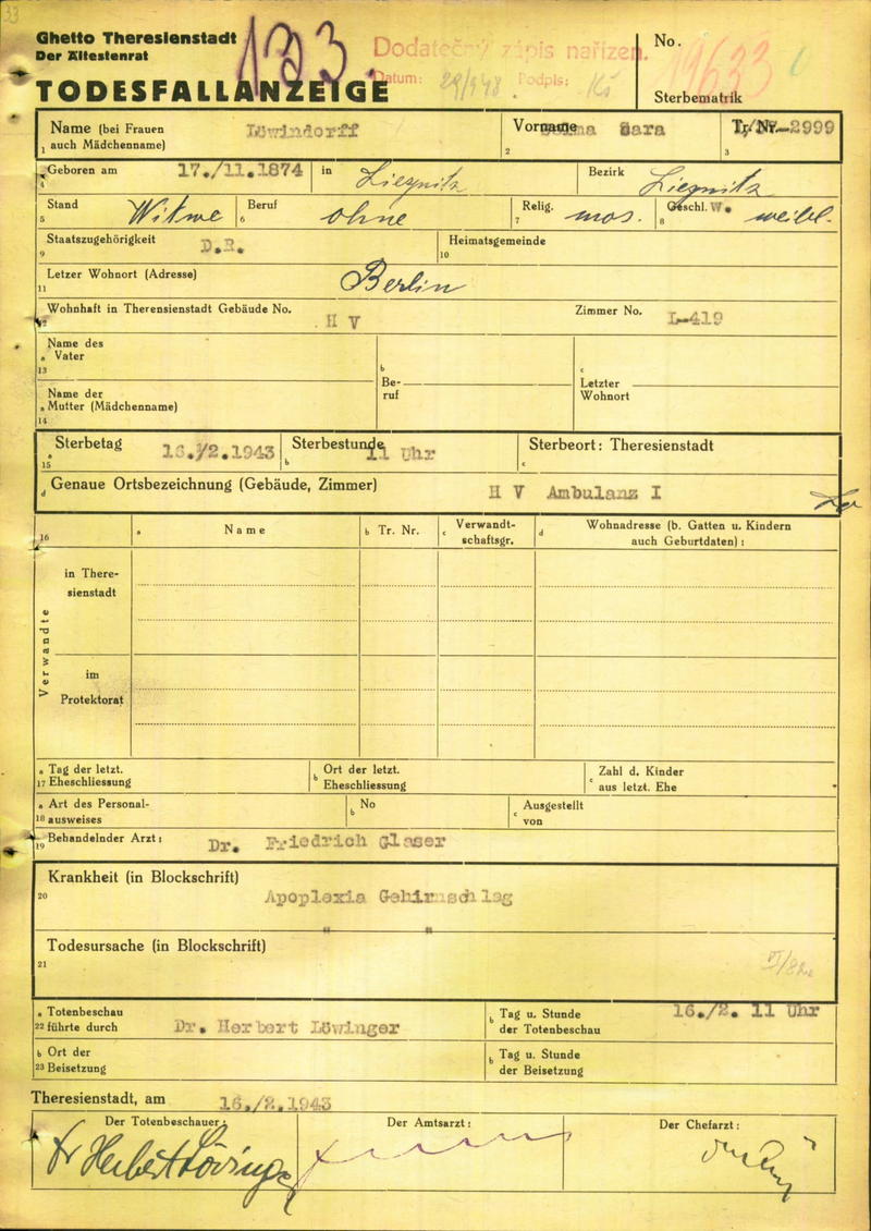 Loewindorff Selma: Death certificate, Ghetto Terezín