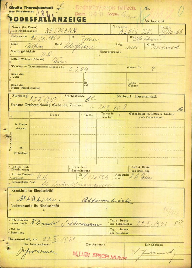 This database contains the names and fates of those who were deported from the territory of today’s Czech Republic, be it their homeland or may they have been deported to the Theresienstadt ghetto before from different european countries. Further, it contains basic information on those men, women and children, most of whom were Roma or Sinti, who died as prisoners of the so-called „Gypsy camp I“ Lety u Písku.