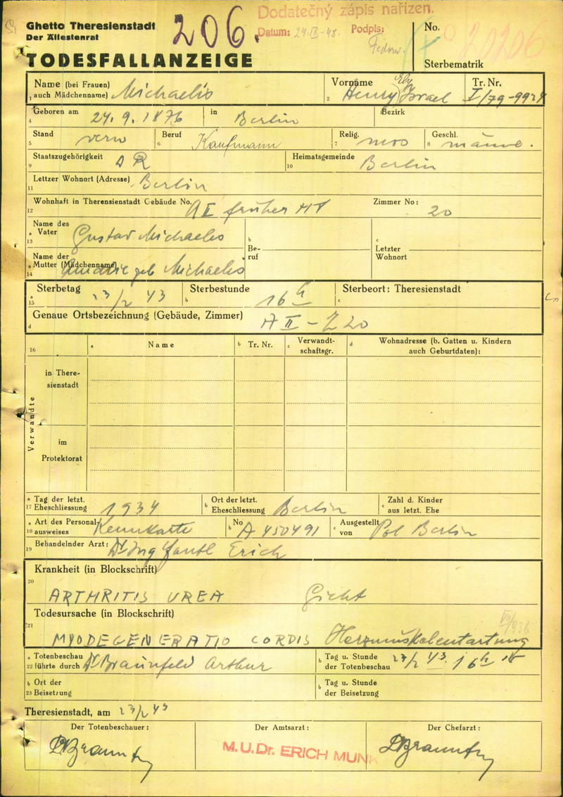 Michaelis Ely-Henry: Death certificate, Ghetto Terezín
