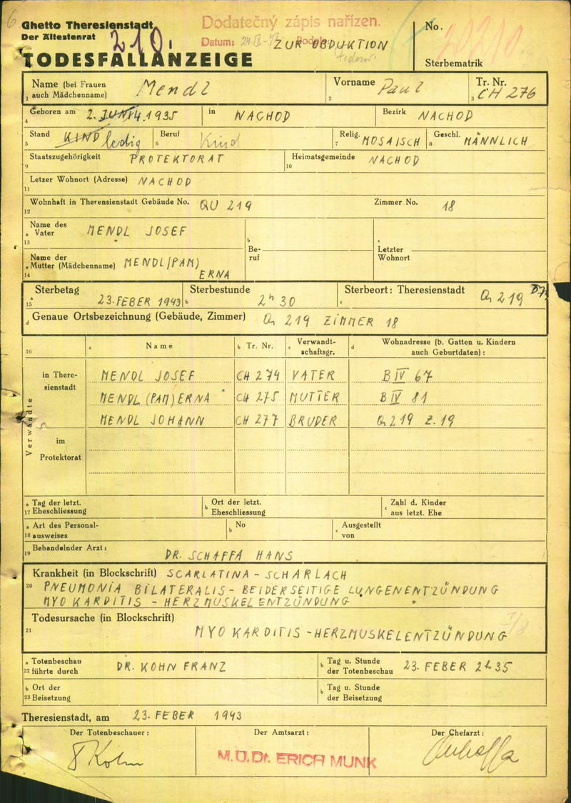 This database contains the names and fates of those who were deported from the territory of today’s Czech Republic, be it their homeland or may they have been deported to the Theresienstadt ghetto before from different european countries. Further, it contains basic information on those men, women and children, most of whom were Roma or Sinti, who died as prisoners of the so-called „Gypsy camp I“ Lety u Písku.