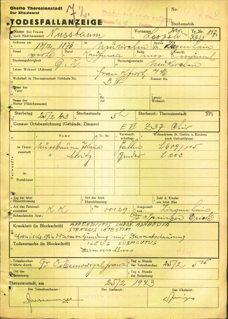 Nussbaum Leopold: Death certificate, Ghetto Terezín