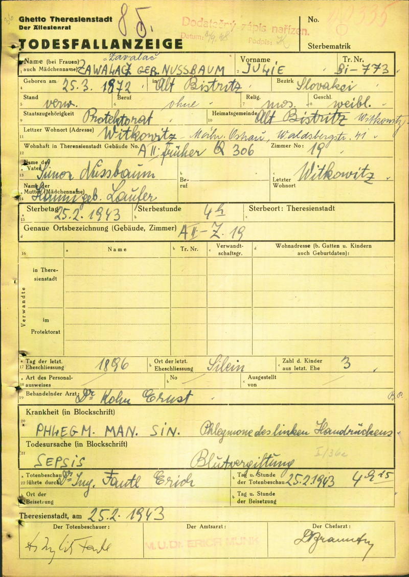 Zawalačová Julie: Death certificate, Ghetto Terezín
