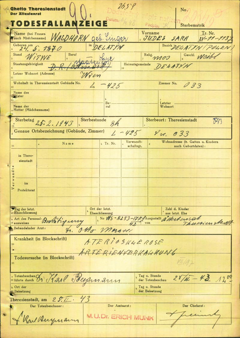 Waldhorn Judis: Death certificate, Ghetto Terezín