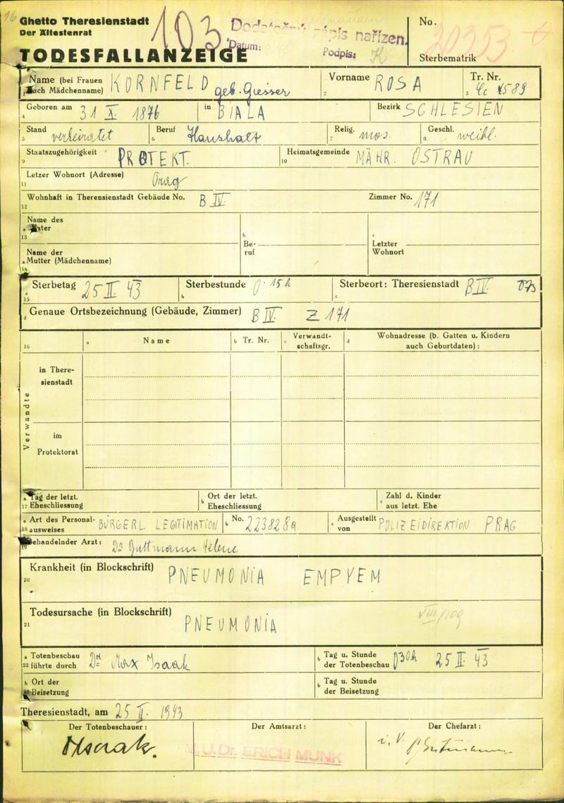 Kornfeldová Růžena: Death certificate, Ghetto Terezín