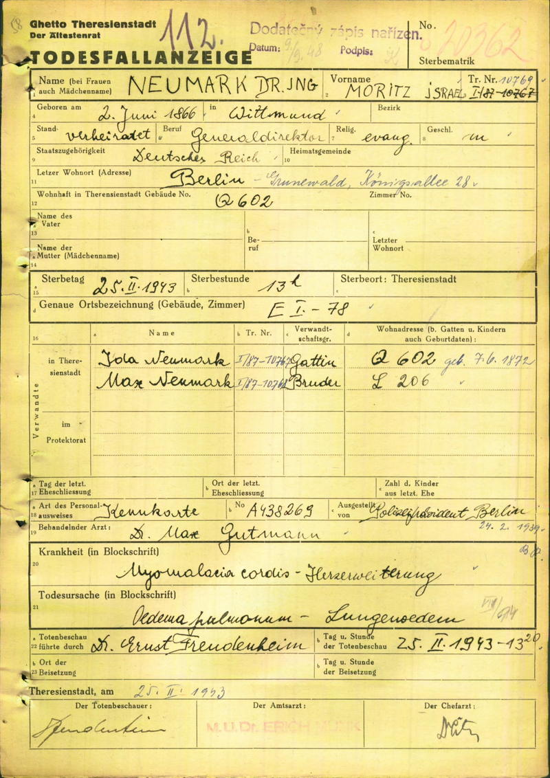 Neumark Moritz: Death certificate, Ghetto Terezín