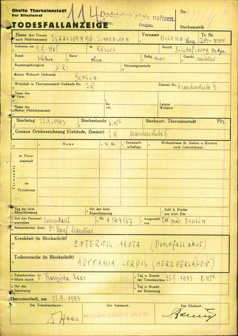 Isaacsohn Helene: Death certificate, Ghetto Terezín