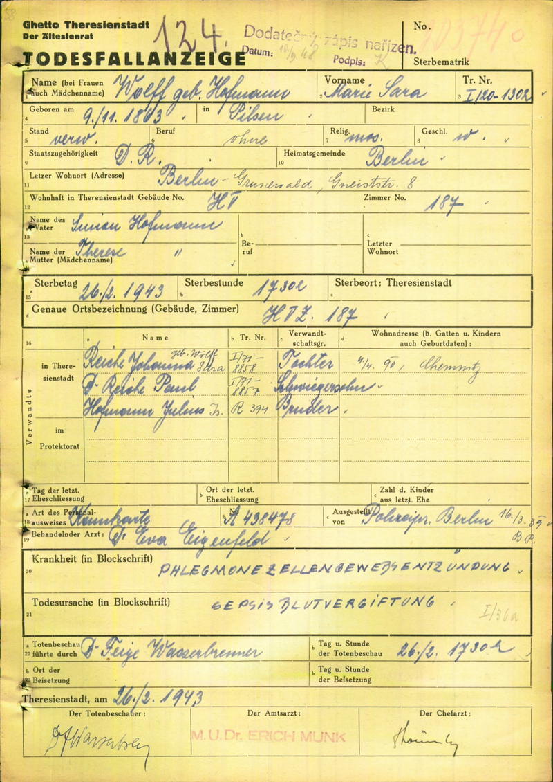Wolff Marie: Death certificate, Ghetto Terezín