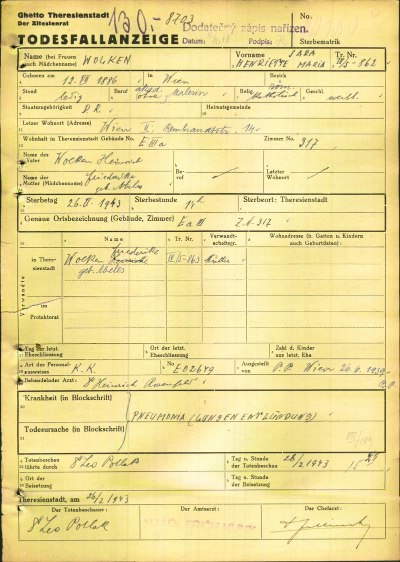 Wolken Henriette Maria: Death certificate, Ghetto Terezín
