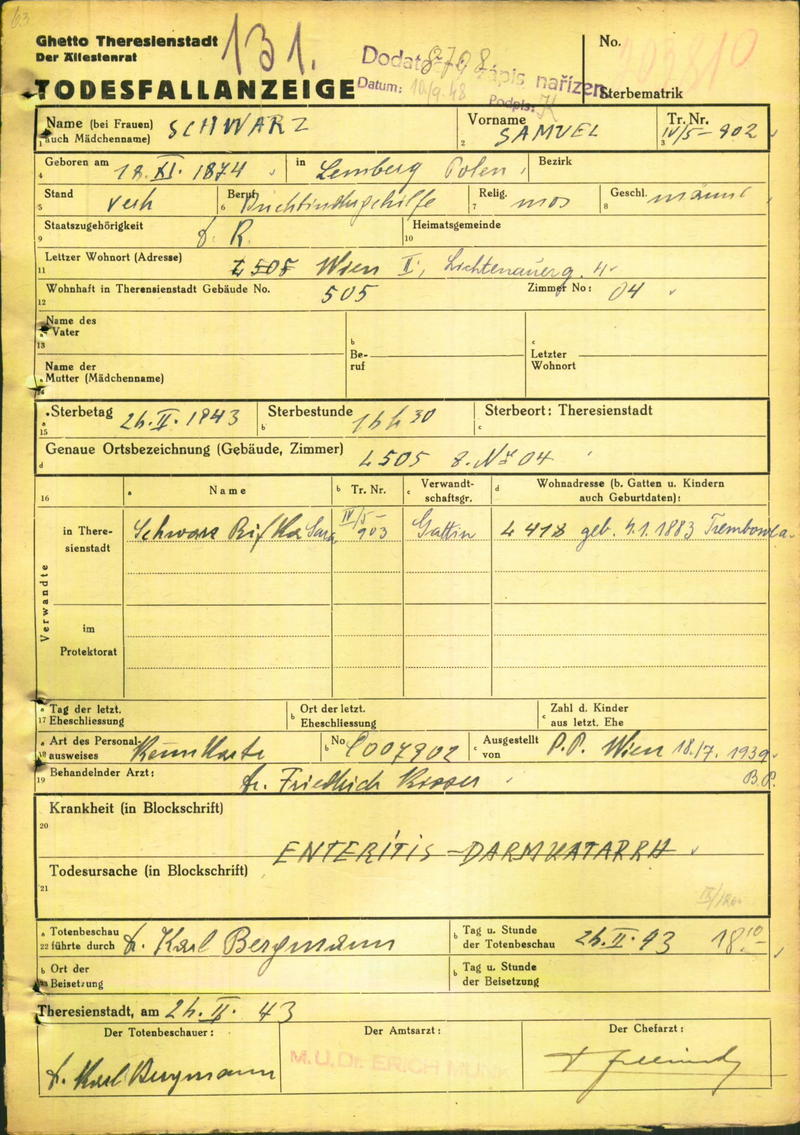 Schwarz Samuel: Death certificate, Ghetto Terezín