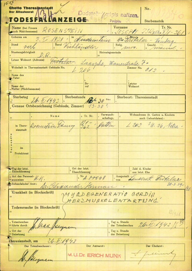 Rosenstein Josef: Death certificate, Ghetto Terezín