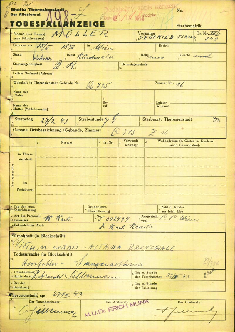 Müller Siegfried: Death certificate, Ghetto Terezín